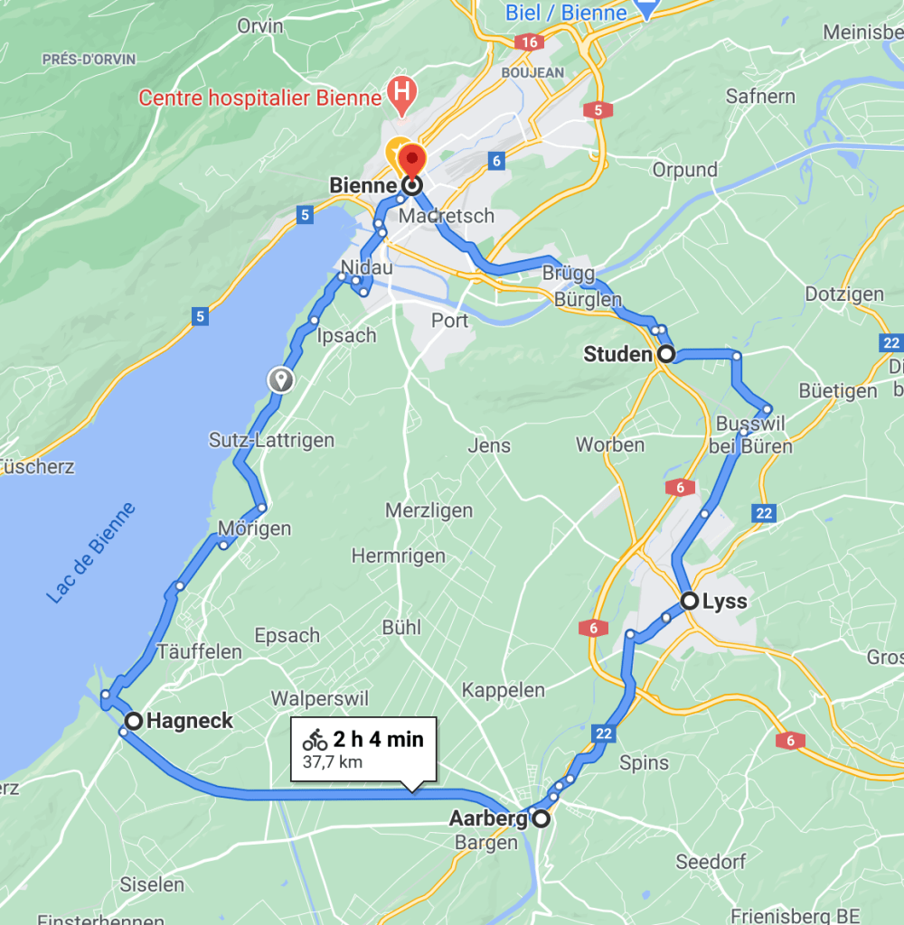 Nous avons fait un super tour à vélo Bienne – Hagneck – Aarberg – Studen -Bienne. 40km très facile et agréable. Peu de traffic motorisé sur l’itinéraire. Nous commençons depuis la route 8 jusqu’à Aarberg, de là on passe à la 44 jusqu’à Lyss, puis la 64 jusqu’à Studen pour revenir à Bienne (Suisse Mobile, la suisse à vélo) . Cela donne à peu près la carte ci-dessous :